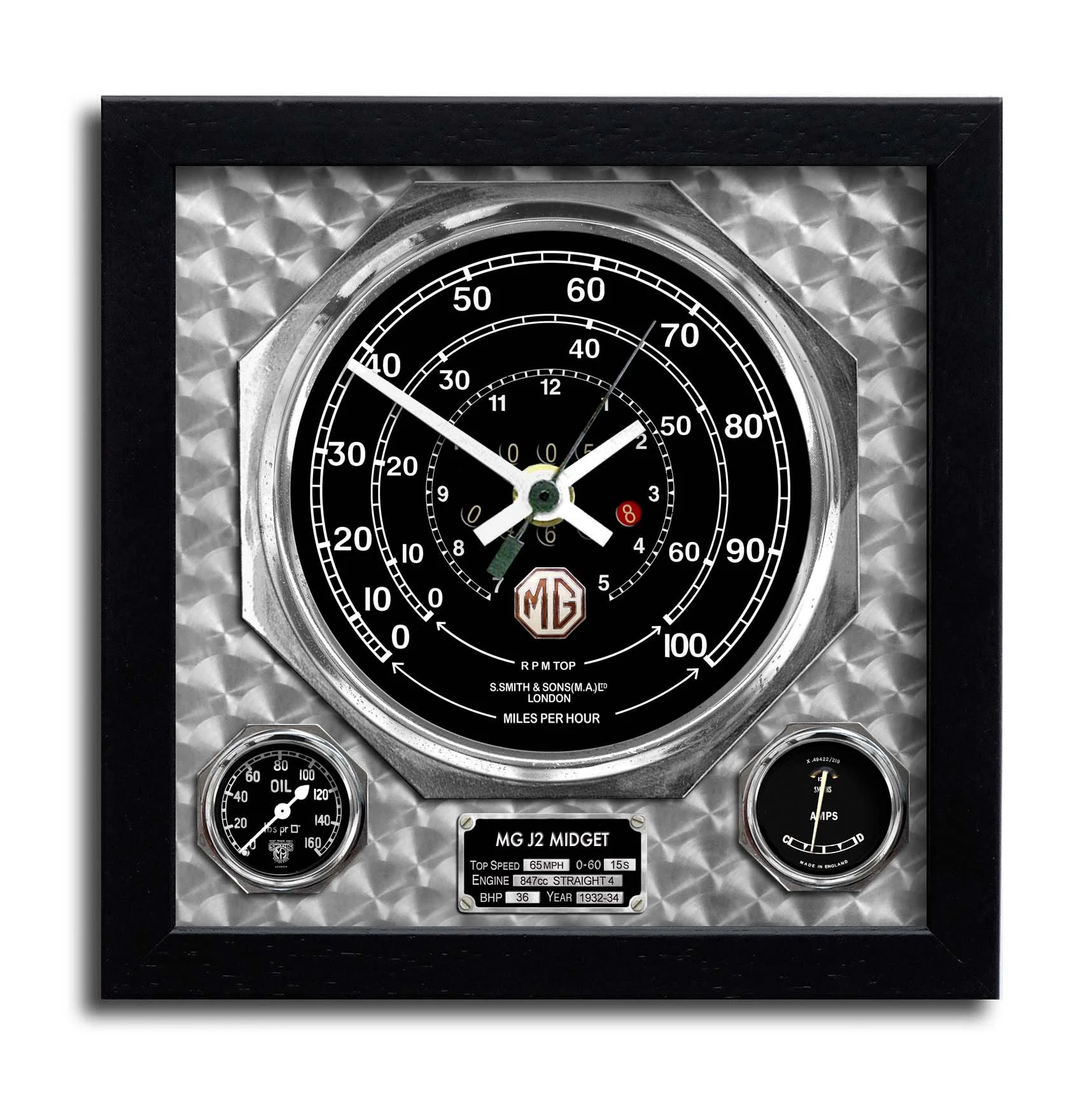 Chronos Design produce a range of hand made wall clocks based on the speedometers of some of the world's great classic cars.The clocks are all hand made by me, Chris Wadden, in Somerset and are framed under glass with a deep rebate wood frame. The clock faces are all created as original artwork printed on heavyweight archival matt art paper and measure 24cm x 24cm. All of the current range is listed alphabetically via the menu at the top right of this page - just click on your make to find the model you’re after.