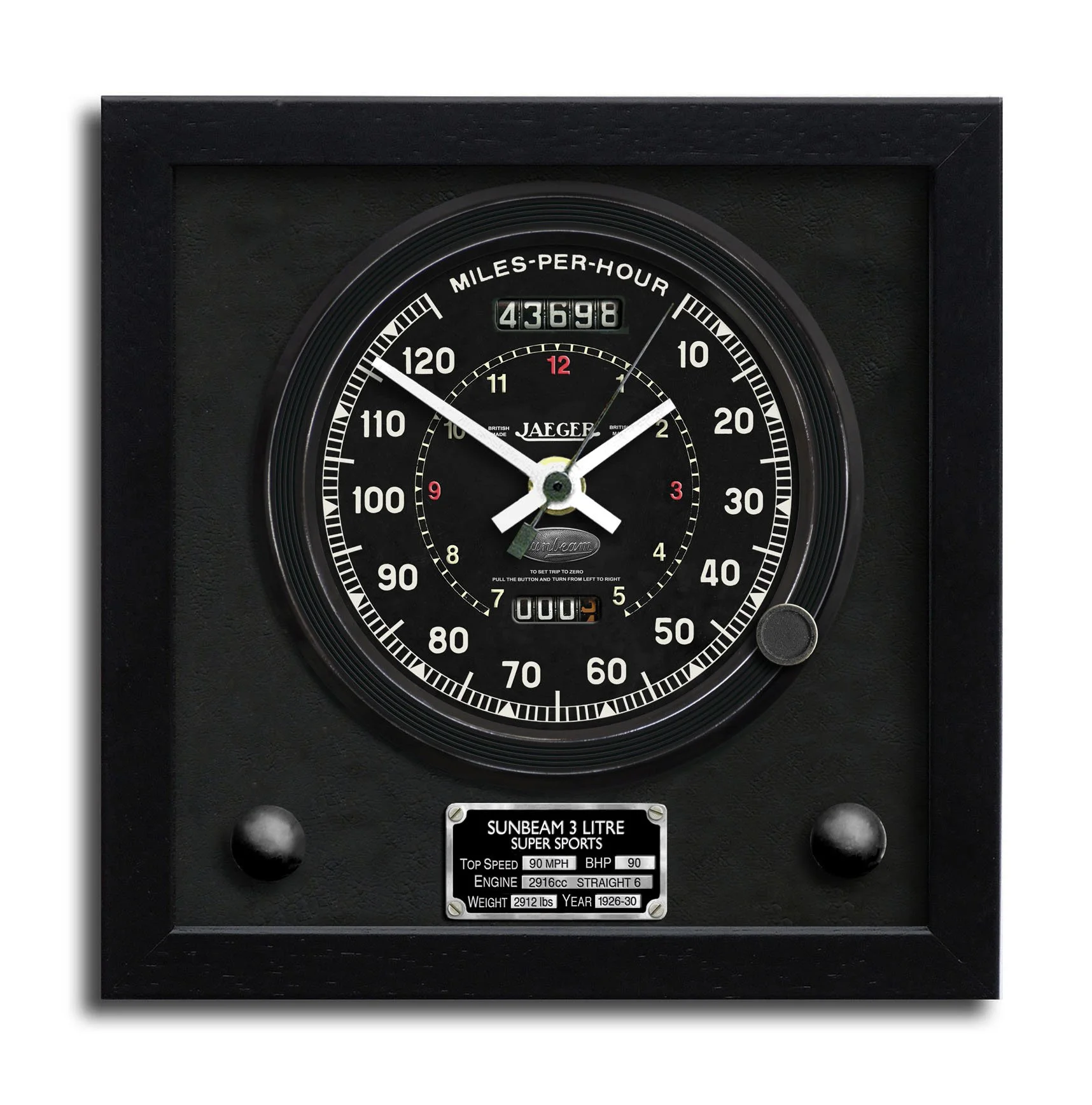 Welcome to our range of classic Saab speedometer wall clocks. All the clocks are hand made to order and usually ready for dispatch within a week. They are framed under glass in a wood frame 24cm square and 4cm deep. Designed from scratch and produced as artwork, they are then printed, using archival inks, on to a heavyweight matte paper. Please note that the whole area within the frame is printed. The clocks run on a German quartz movement powered by a single AA battery, not supplied.